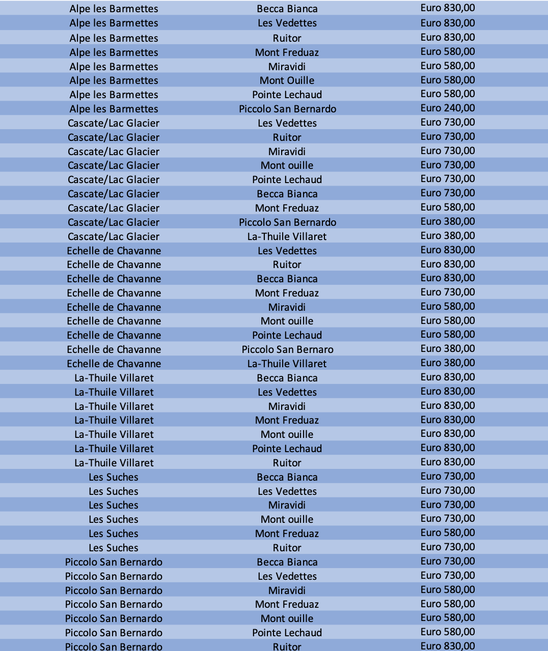En supplément : prix du taxi à partager (environs 60 €) + forfait des remontées depuis La Rosière à La Thuile |